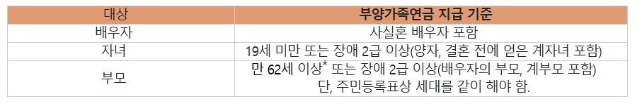 - 노령연금: 국민연금을 받고 있는 노령연금 수급자가 부양하는 가족