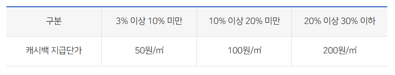 즉, 전년 같은 기간 대비 가스 사용량을 3% 이상 줄이면 절감한 양에 따라 1㎥당 최대 200원까지 캐시백을 받을 수 있는 혜택입니다.
