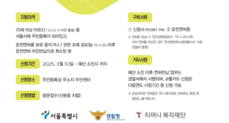 지원 대상은 서울시에 주민등록을 둔 70세 이상(면허 반납일 기준 1955년 12월 31일 이전 출생자) 어르신 중 기존에 운전면허 자진 반납 혜택을 받은 적이 없는 분들입니다. 올해 지원 대상자는 총 3만 1,800명이며, 선착순으로 지급됩니다.