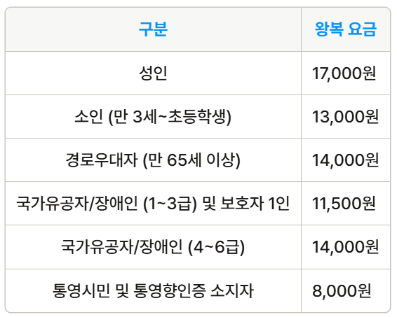 이처럼 다양한 요금 체계가 마련되어 있어, 본인의 상황에 맞는 요금을 선택할 수 있습니다. 특히 통영시민이나 통영향인증 소지자는 할인 혜택을 받을 수 있어 더욱 경제적인 여행이 가능합니다.