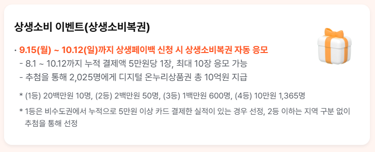 상생페이백 신청 시 자동 응모되며, 9월 15일부터 10월 12일까지 전통시장과 소상공인 매장에서 5만 원 이상 카드 결제 시 5만 원당 1장의 복권이 지급됩니다(최대 10장). 수도권을 제외한 비수도권 소비자만 1등 당첨 자격이 부여되고, 당첨자 총 2025명에게 10억 원 규모의 상금이 돌아갑니다.