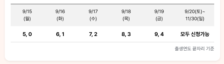 5부제로 출생연도 끝자리별 신청 요일이 다르며, 만 19세 이상 국민과 외국인 등록증 보유자가 대상입니다.
