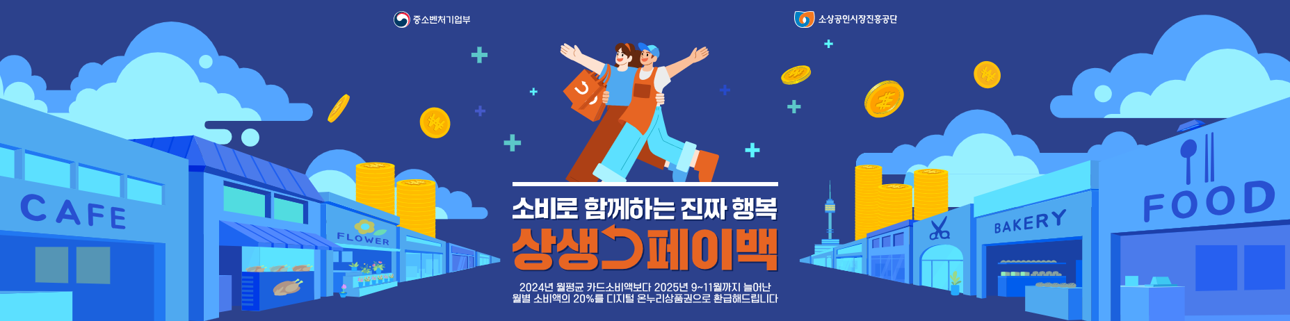 지난해 월평균 카드 사용액 대비 올해 9월부터 11월까지 카드 소비가 증가한 금액의 20%를 디지털 온누리상품권으로 환급합니다. 월 최대 10만 원, 3개월간 최대 30만 원까지 환급 가능하며, 전통시장, 동네 마트, 소규모 식당 등에서 사용한 금액이 인정됩니다.