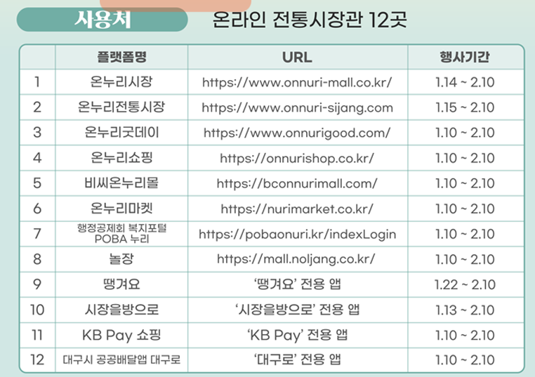 디지털 온누리상품권 사용 가능한 온라인 전통시장관들은 아래와 같습니다.