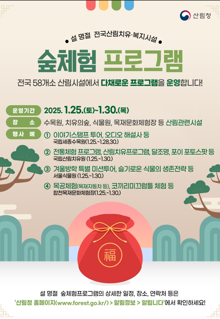 이번 설 연휴(1.25~1.30)를 맞아 전국의 주요 산림시설에서 다양한 특별 프로그램을 준비한 프로그램을 상세하게 정리해 보았습니다. 가족들이 오랜만에 함께 모이는 명절인 만큼 자연 속에서 특별한 추억을 만들어 보시는건 어떨까요?
