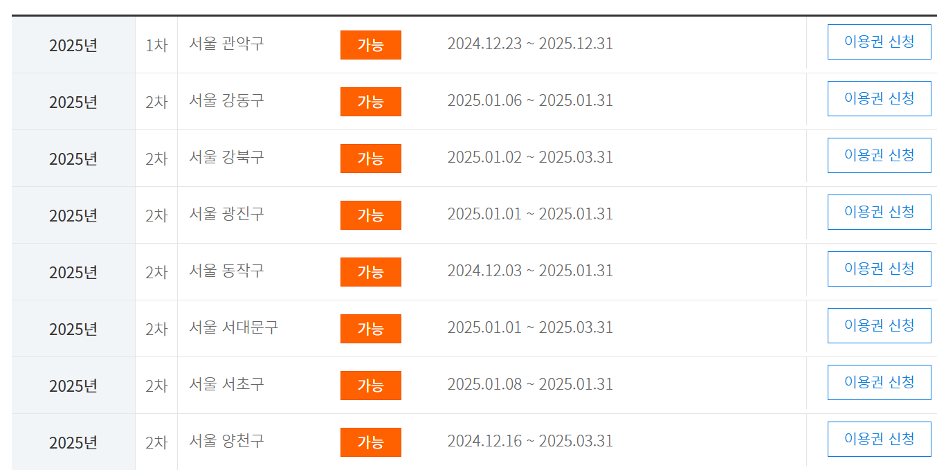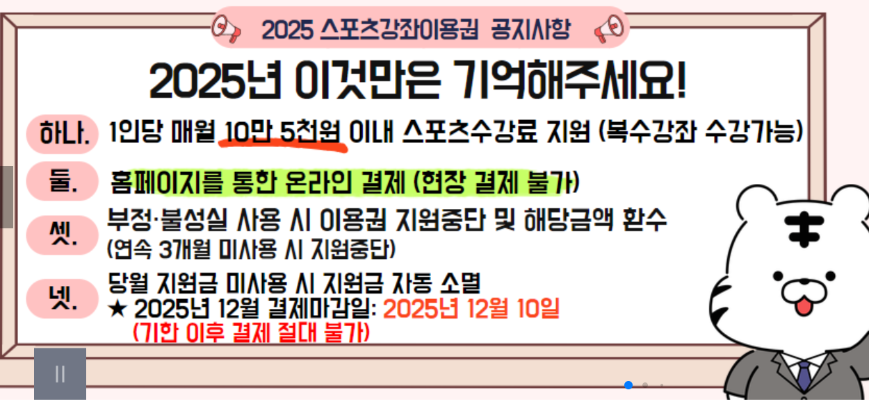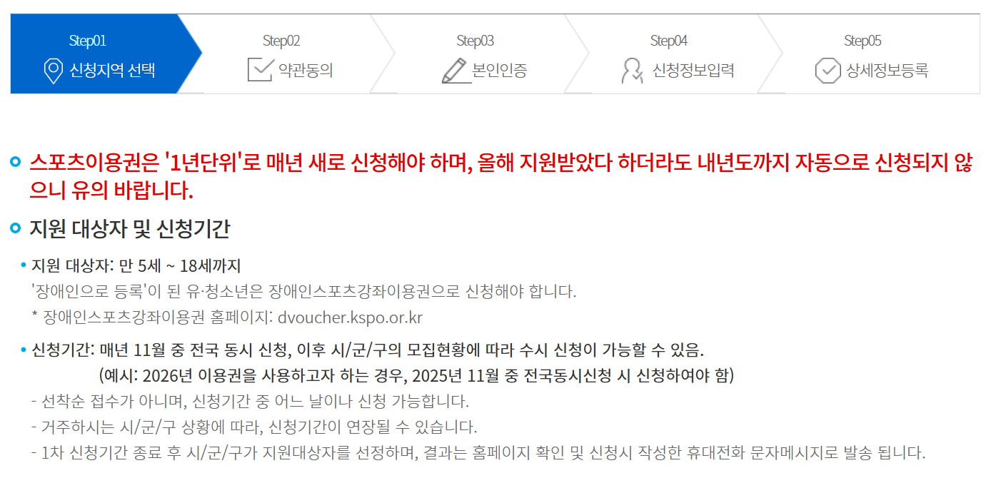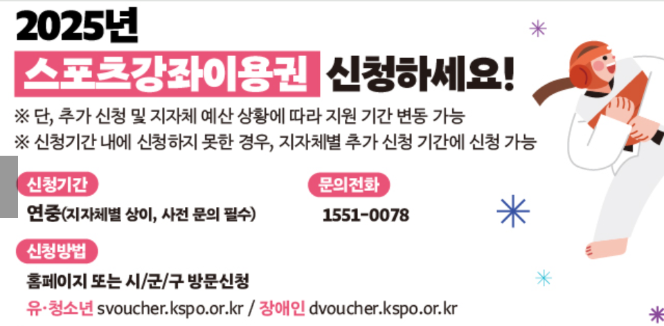 2025년 현재 2차 접수가 진행중입니다. 홈페이지에 들어가서 지역을 선정, 스포츠 강좌 이용권 누리집에서 간편하게 신청할 수 있으니 이 기회를 놓치지 마세요.