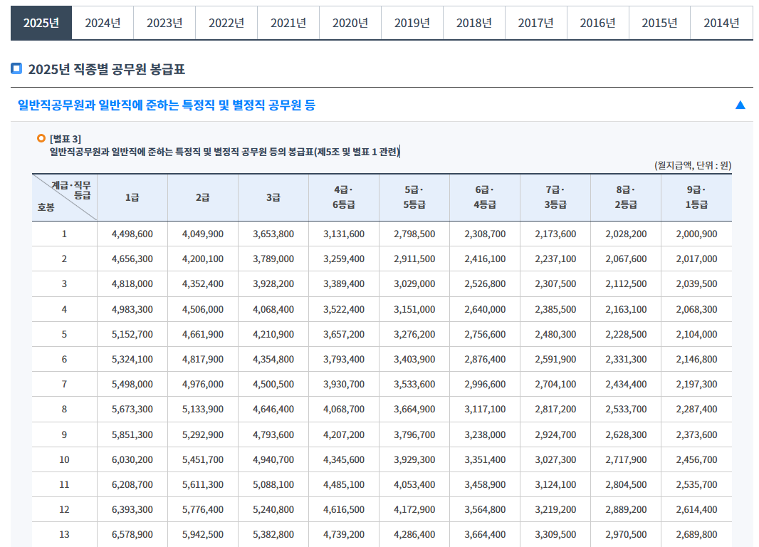 2025년 공무원 봉급표