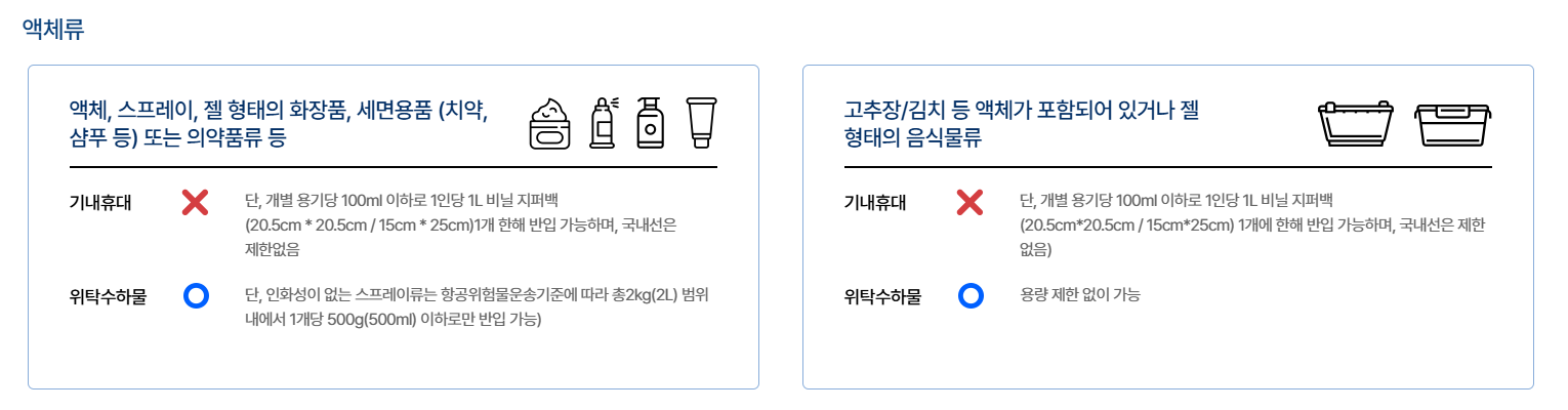 100㎖ 이하 용기 사용 시 1ℓ 이하 투명 비닐봉투에 밀봉하면 반입 가능