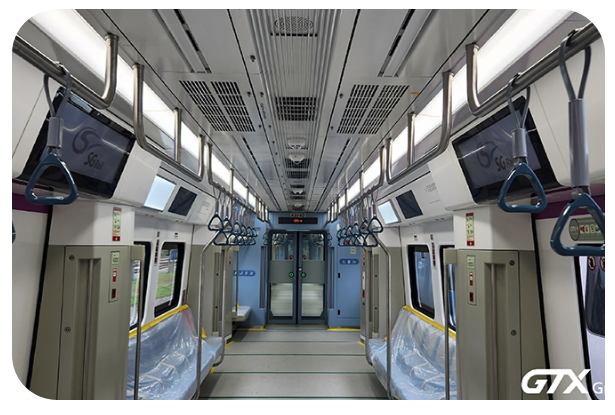 GTX-A는 총 8량으로 구성된 열차로 1량당 일반석 28석, 노략자석 8석 등 총 36석으로 구성되어 있습니다. 일반 지하철과는 달리 각 좌석 사이에 분리대가 있고, 객차 1량당 공기청정기도 네 대씩 설치되어 있습니다.