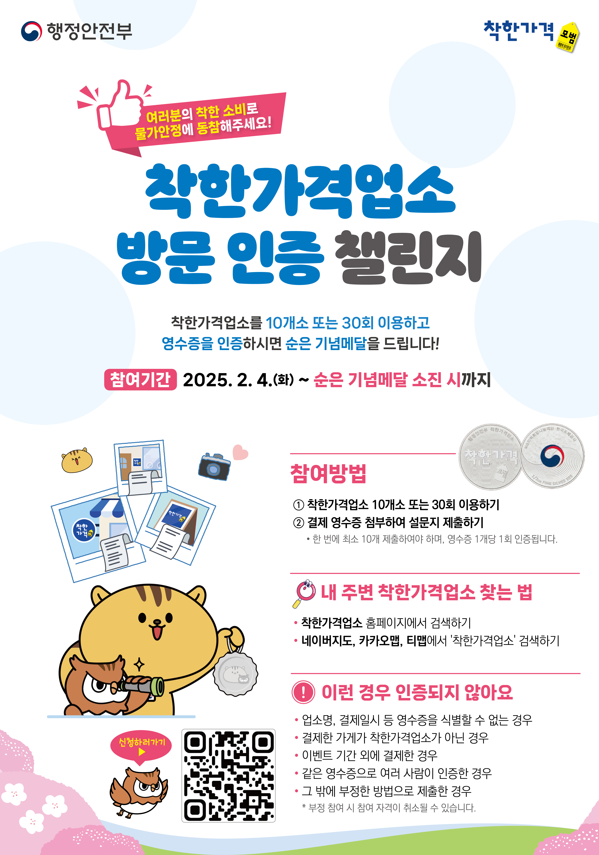 정부와 지방자치단체에서 선정한 착한가격업소를 이용하면, 합리적인 가격으로 좋은 서비스를 받을 수 있을 뿐만 아니라, 특별한 이벤트를 통해 순은 기념메달까지 받을 수 있는 기회가 주어진답니다!